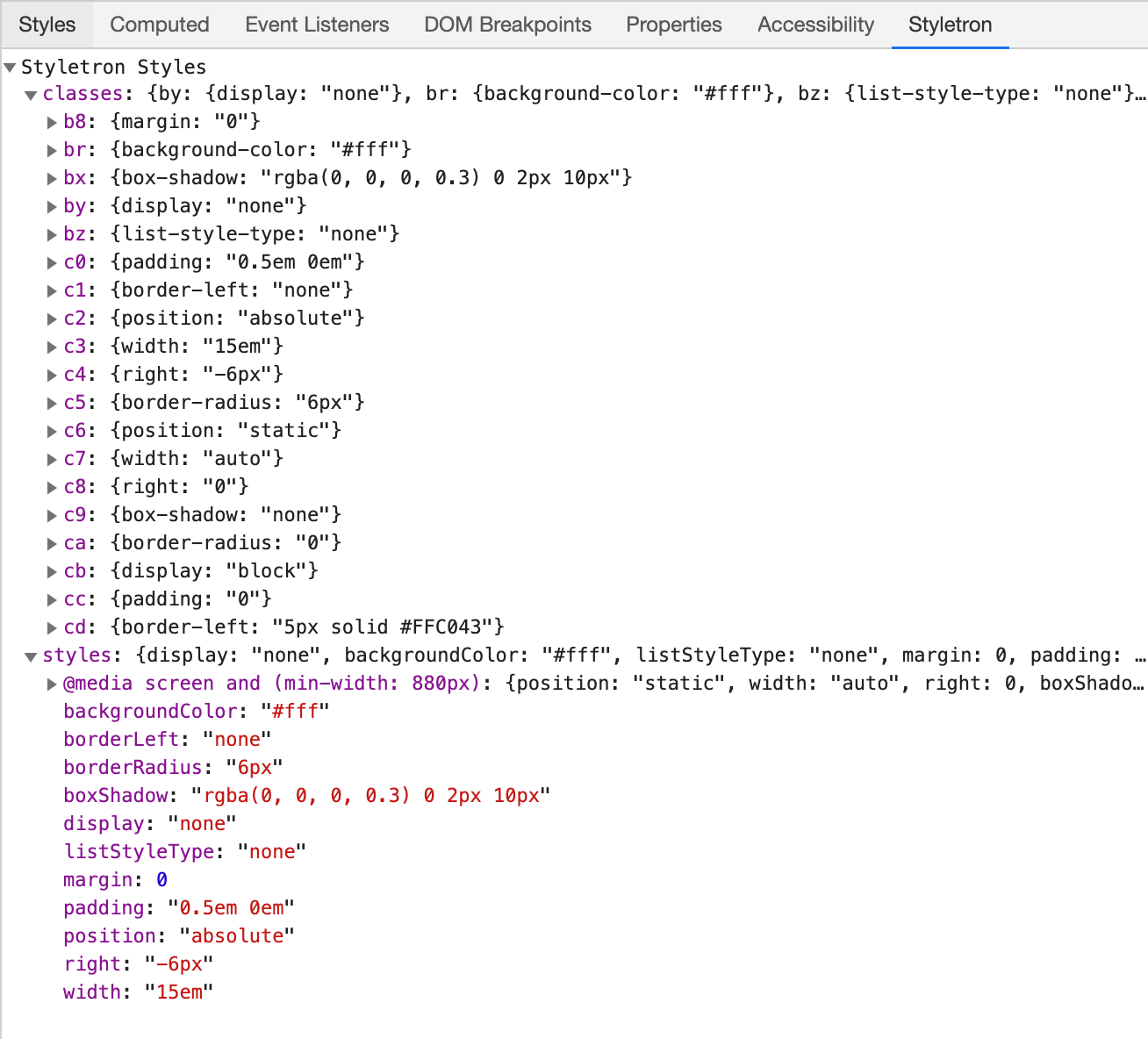 There is an another option that can make the resulting styles more readable even without using the debugging mode and source maps. Styletron offers a Chrome extension. When your app is in the dev mode (NODE_ENV=development), it adds a new panel into the devtools: